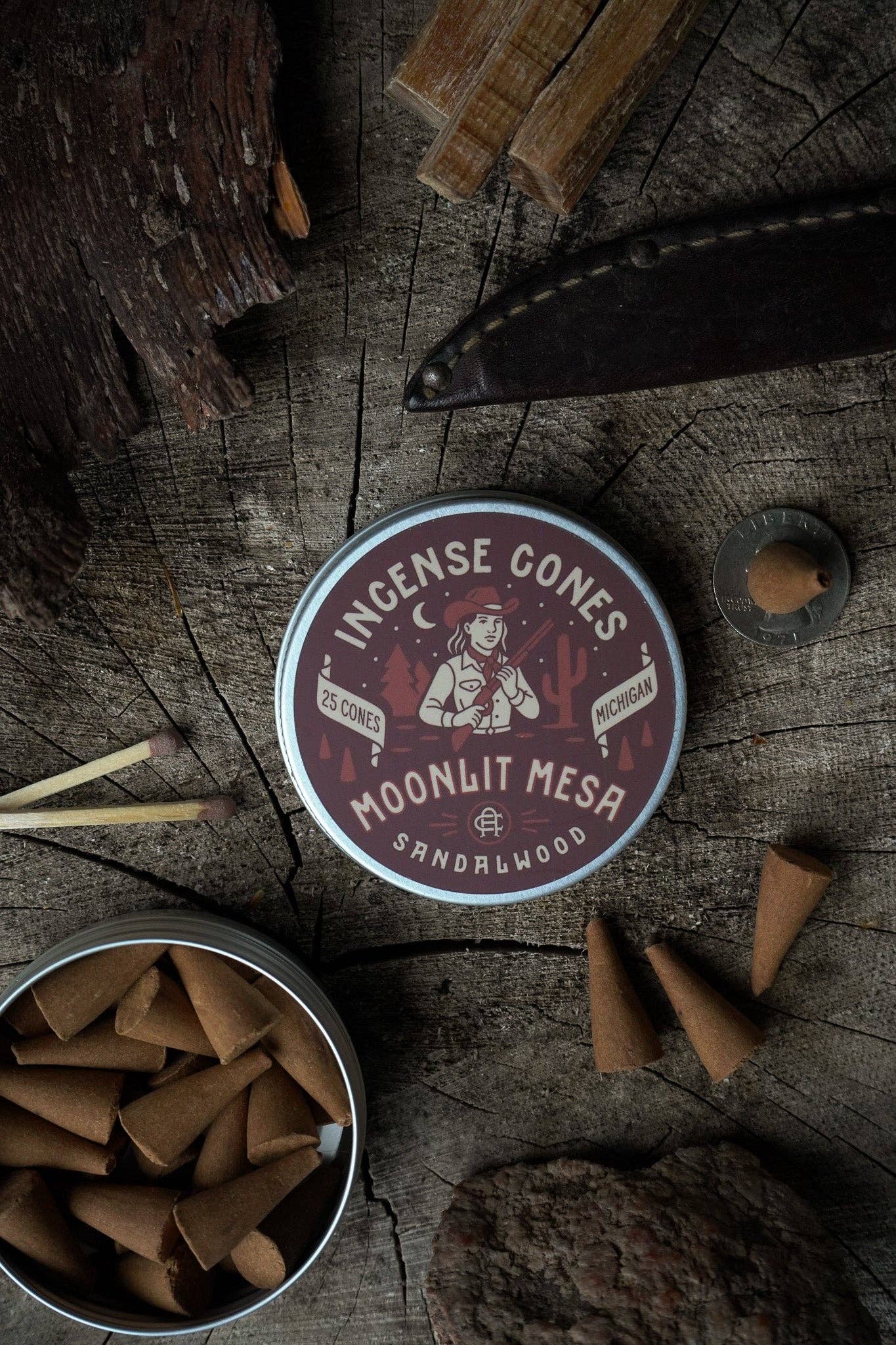 Crafted with care and intention, every cone is soaked, dried, and packed by hand in small batches. Scent Profile: Sandalwood -25 incense cones per tin -20-30 minute burn-time per cone -Free of phthalates -Never tested on animals To Use: Place cone on a fire resistant surface. Light the tip of the cone and let it burn for about 10 seconds. Blow it out and allow it to smolder. Keep away from flammable objects, children and pets. Please note: While we strive for consistency, small variations may occur due to supplier limitations.