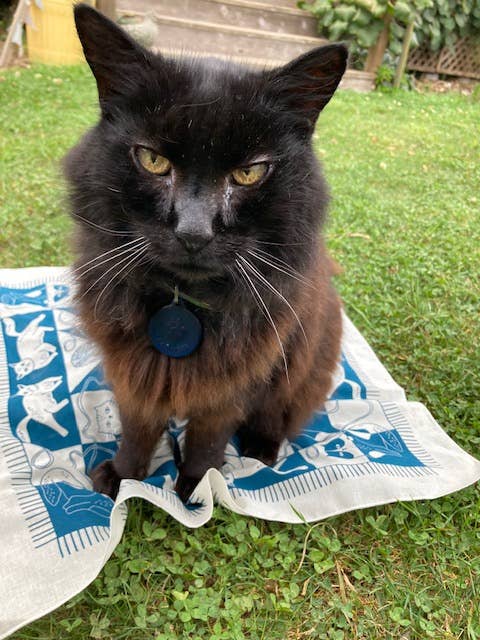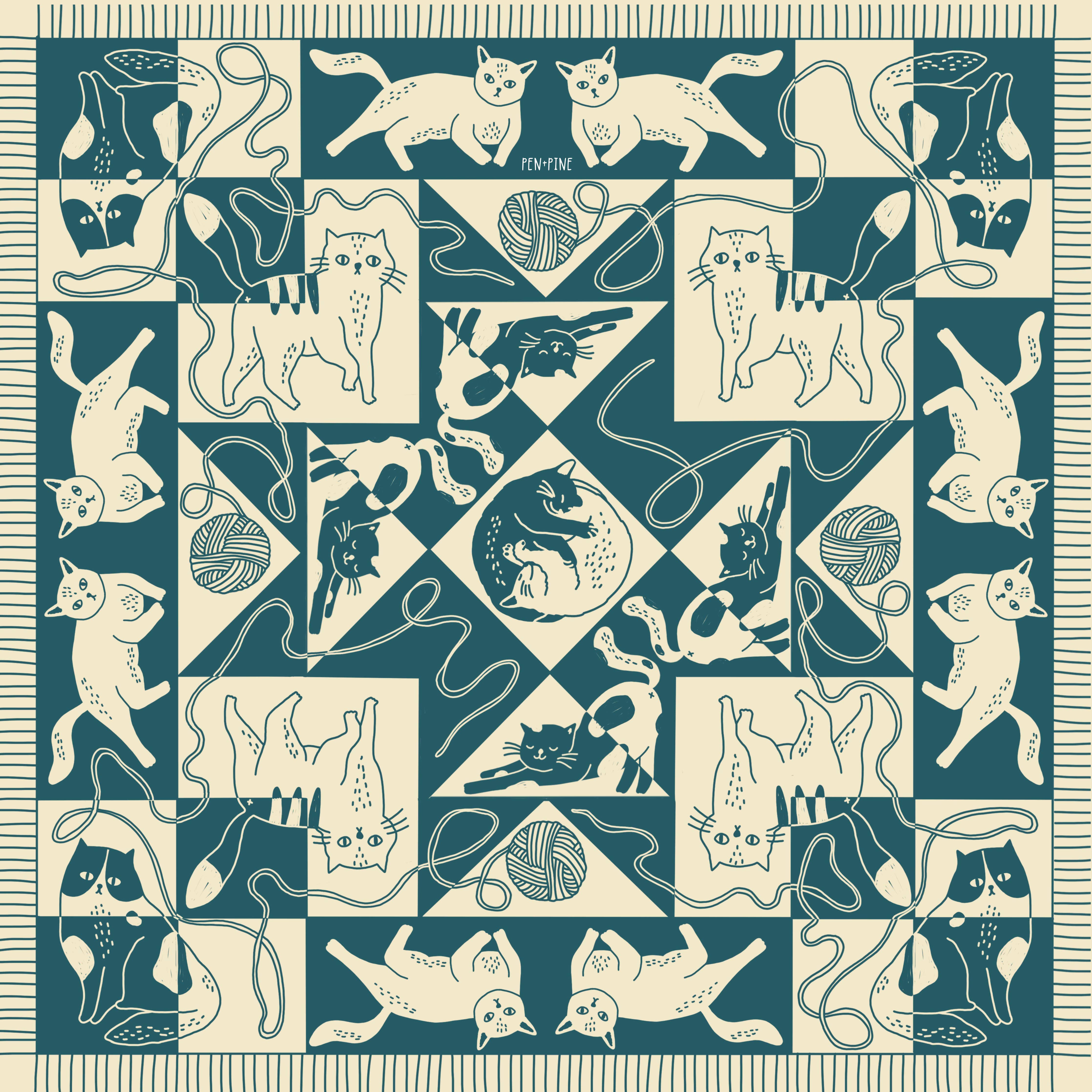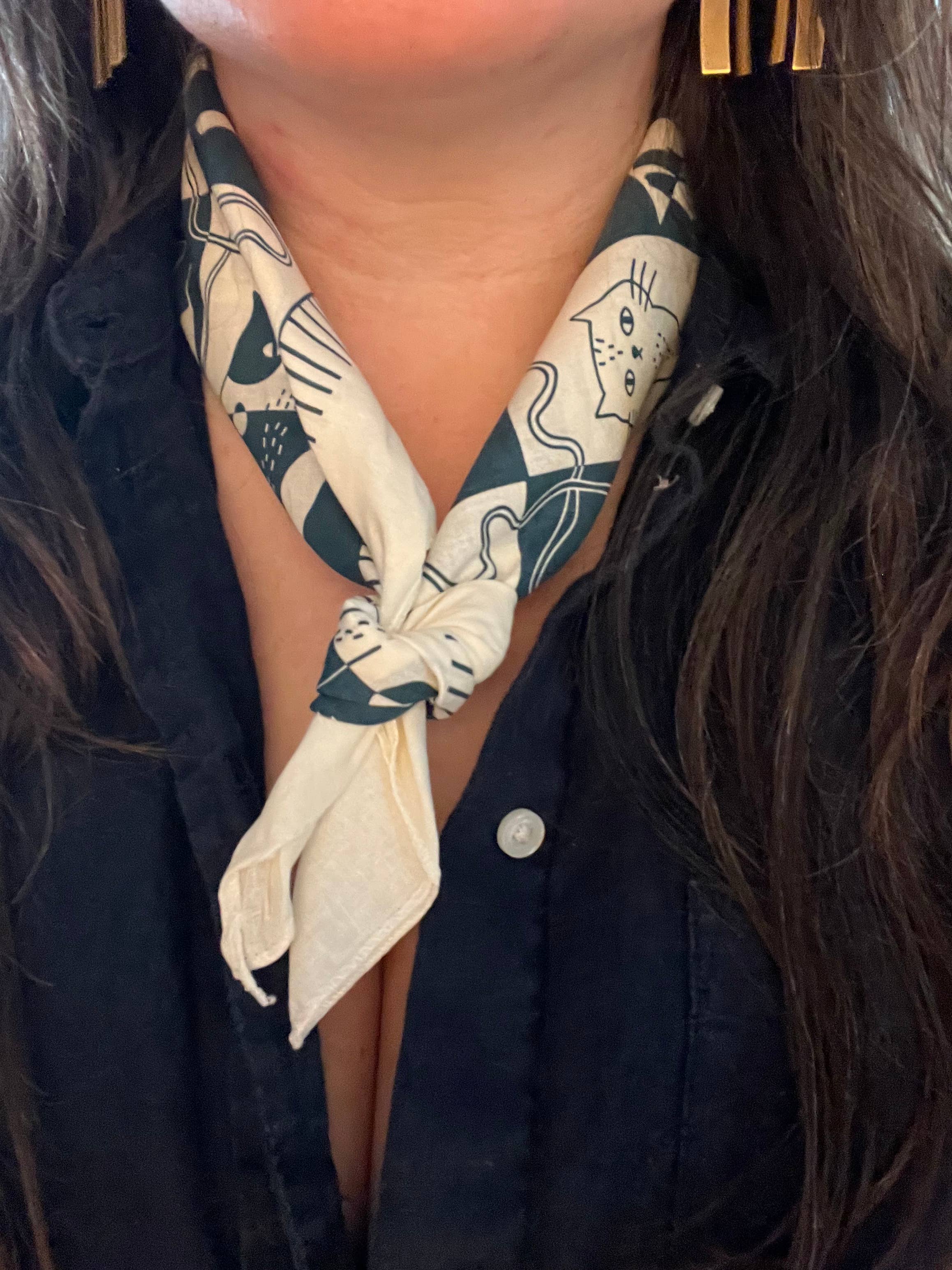 This 22” cotton bandana is the cutest thing you have ever seen - featuring a quilt motif and a whole bunch of adorable cats. The illustration is silk screened with water-based ink in dark blue/green on a natural tan colored bandana. These bandanas are printed in California using eco-friendly methods.