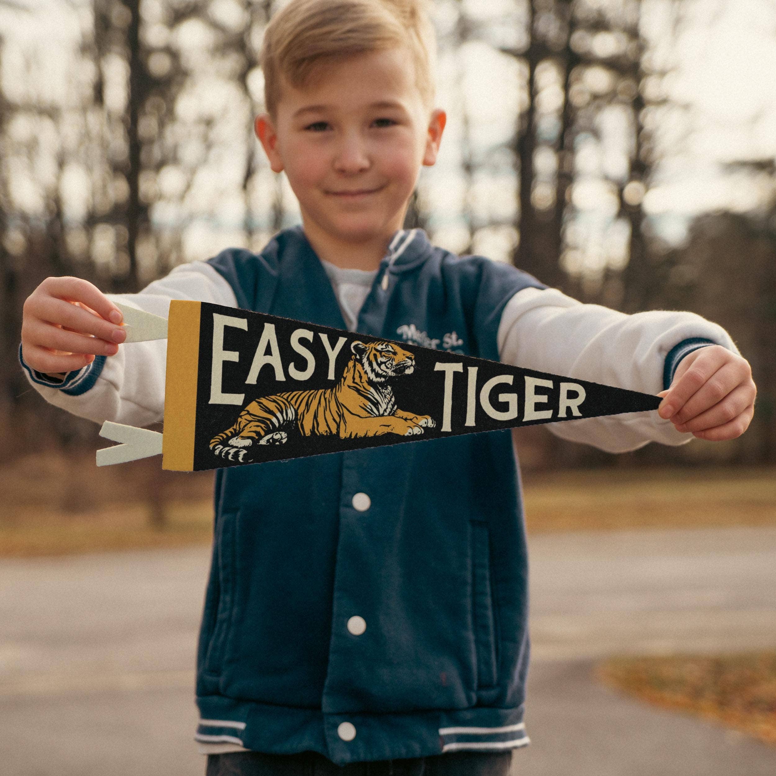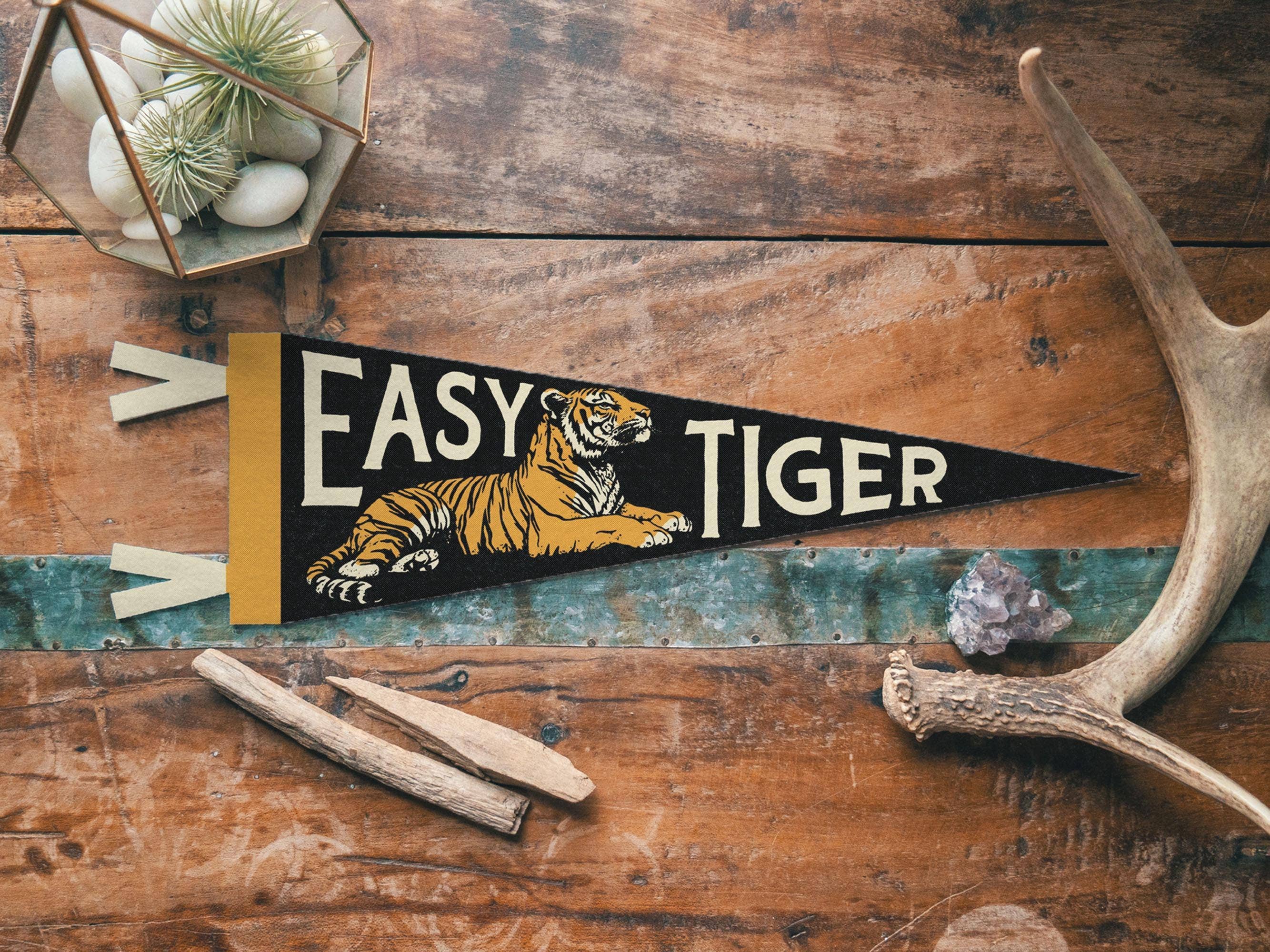 Whoa, slow down now with our vintage inspired "Easy Tiger" felt pennant! Featuring, you guessed it, a Tiger takin' it easy, this pennant will bring you vintage charm and remind you to take a breath and think things through. Appreciate the little things, and so on!