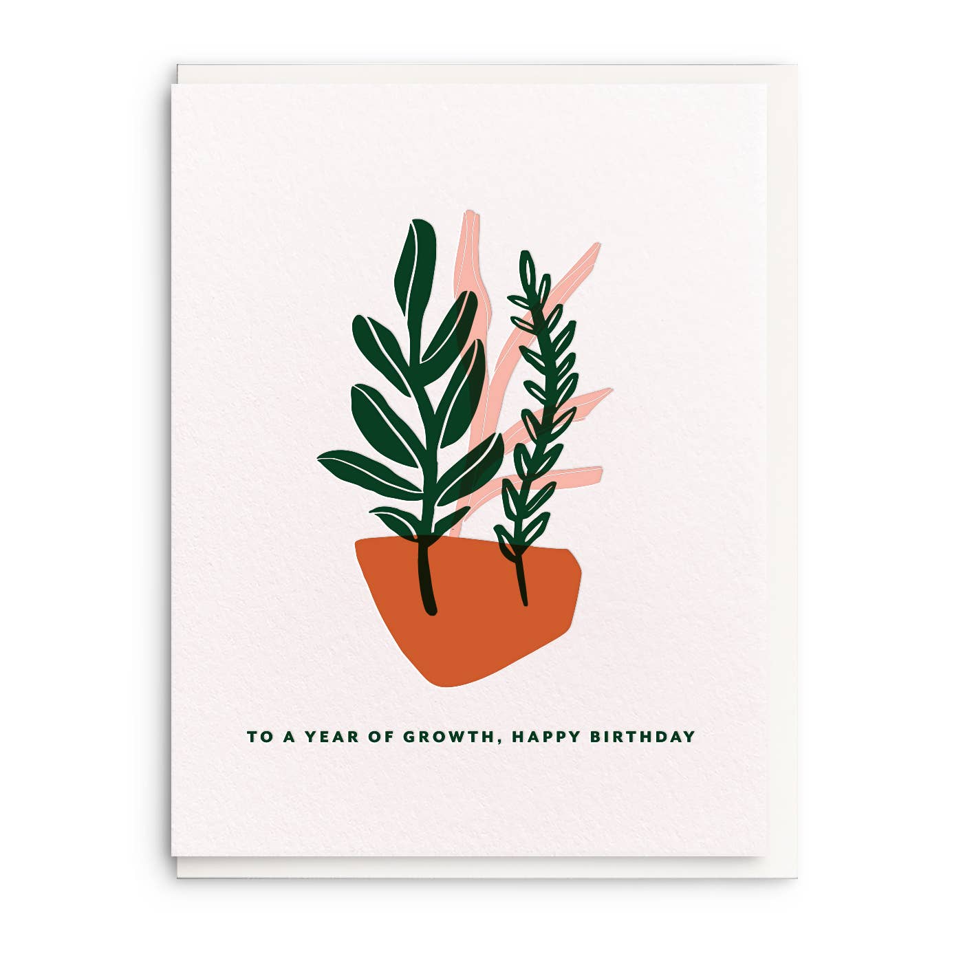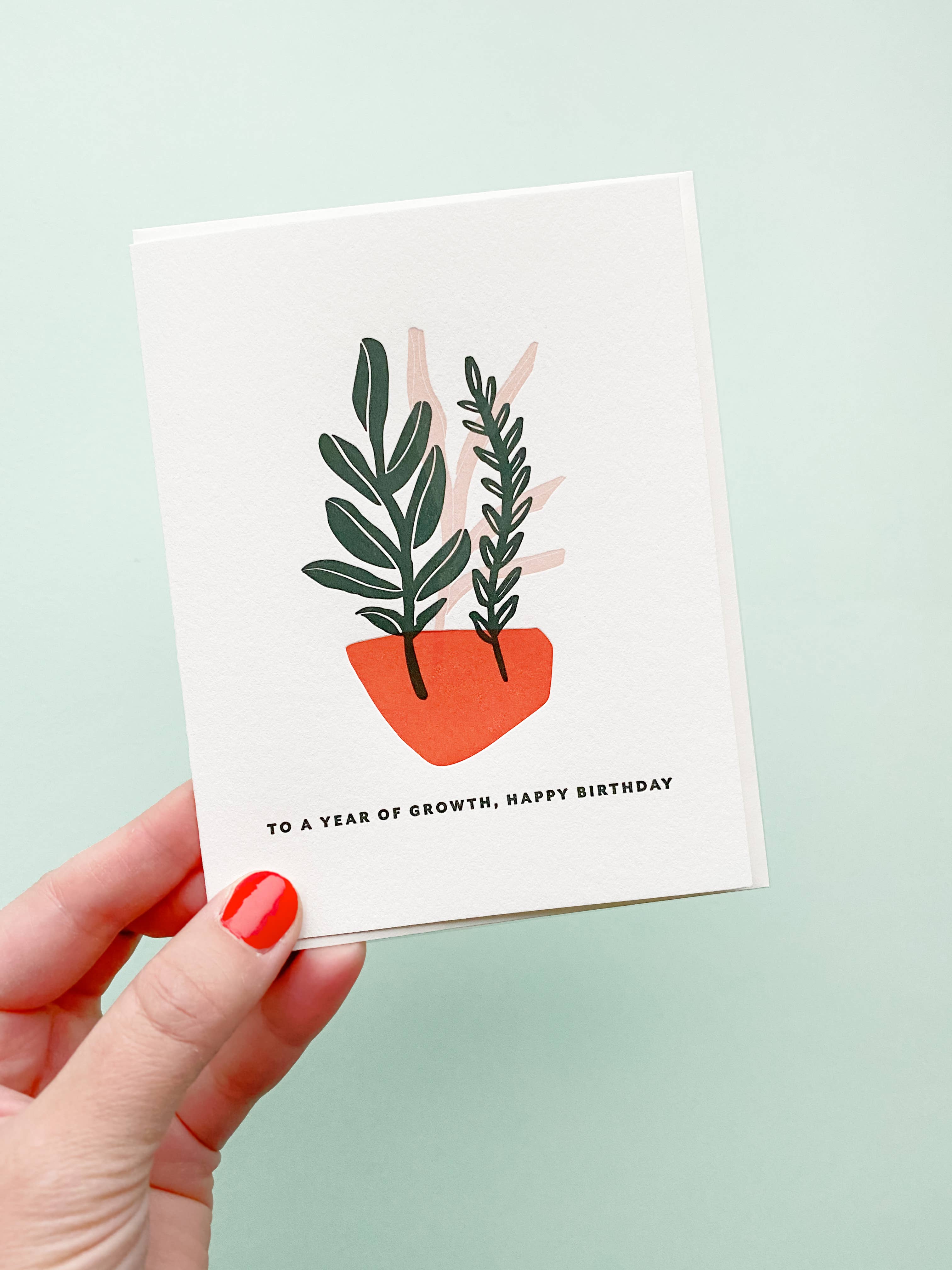 CELEBRATE A YEAR OF GROWTH WITH THIS CARD! Featuring a vibrant plant illustration, this card is perfect for nature lovers and those who need a boost of encouragement for the year ahead. This card will be a wonderful space to convey your heartfelt wishes with its welcoming typography and eye-catching color palette! Blank inside for your personal message, this greeting is hand illustrated and letterpress printed on plush paper, and comes with a coordinating envelope. Single, hand illustrated greeting card letterpress printed on plush 100% cotton paper. Made in the USA. includes: 1 card + 1 envelope // size: 4.25 x 5.5" folded // packaging: cellophane sleeve // interior: blank // minimum: 6 per design style // Made in the USA